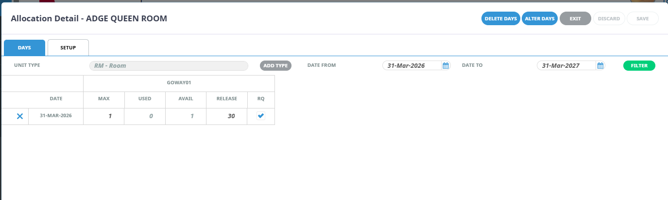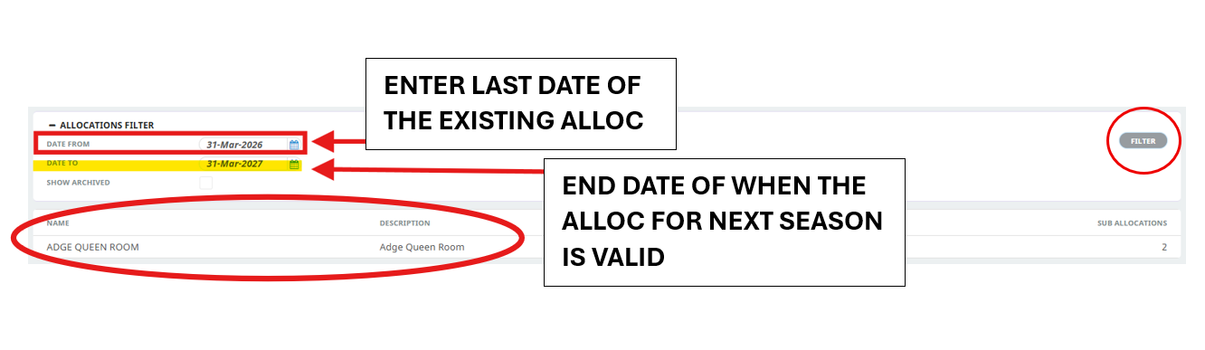 1. When extending allotment/freesell, it is a MUST to update the DATE FROM & DATE TO from the Allocation Header filter to the last date of the existing allotment and the end of date of the allocation to be extended. Then click "FILTER" button and select the room/tour that you'll extend and the Allocation Detail Screen will show.