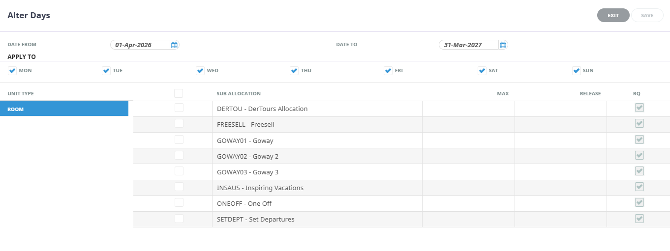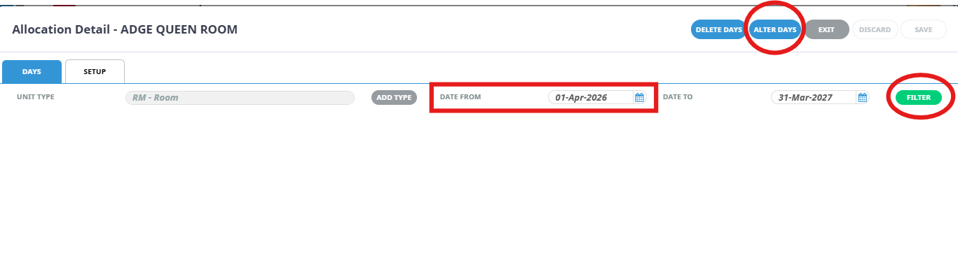 From the Alter Days section, you can also enter specific dates. For example, if the supplier provides different allotments or release days for Low Season and High Season, you can input only the dates relevant to each season instead of entering the entire fiscal year.